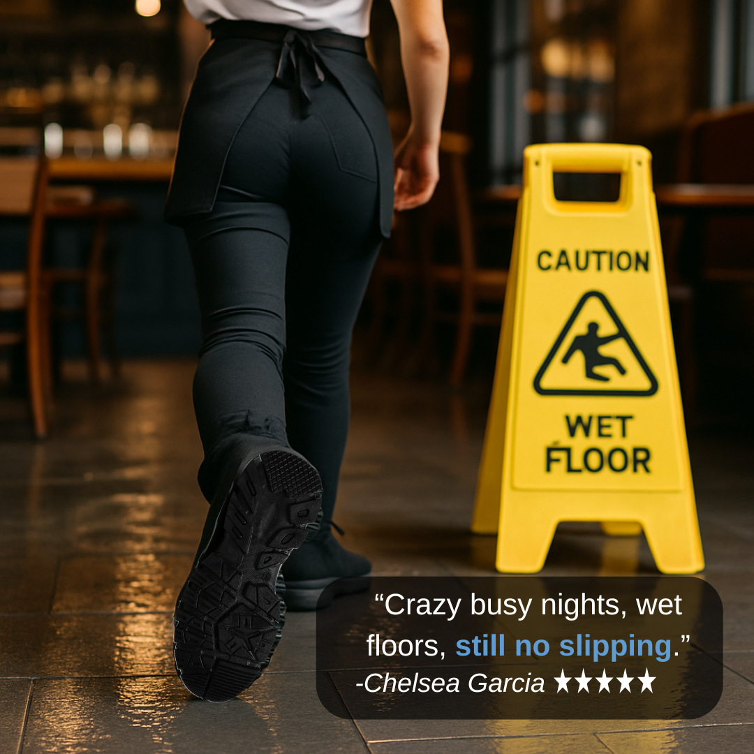 Designed for servers and bartenders, these lightweight, orthopedic shoes deliver all-day comfort, serious cushioning, and slip-resistant grip. Perfect for long shifts on any surface. Whether you're behind the bar or on the floor, your feet, legs, and back stay supported every step of the shift.